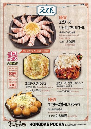 【えび】エビチーズサムギョプサルロール、エビチーズフォンデュ他。